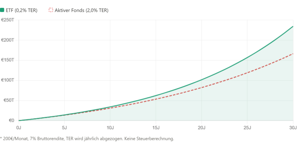 Weil kein teurer Fondsmanager bezahlt werden muss. Die jährlichen Kosten eines ETFs – der sogenannte TER (Total Expense Ratio) – liegen oft bei 0,1 bis 0,3 Prozent pro Jahr. Aktive Fonds kosten oft das Zehnfache.