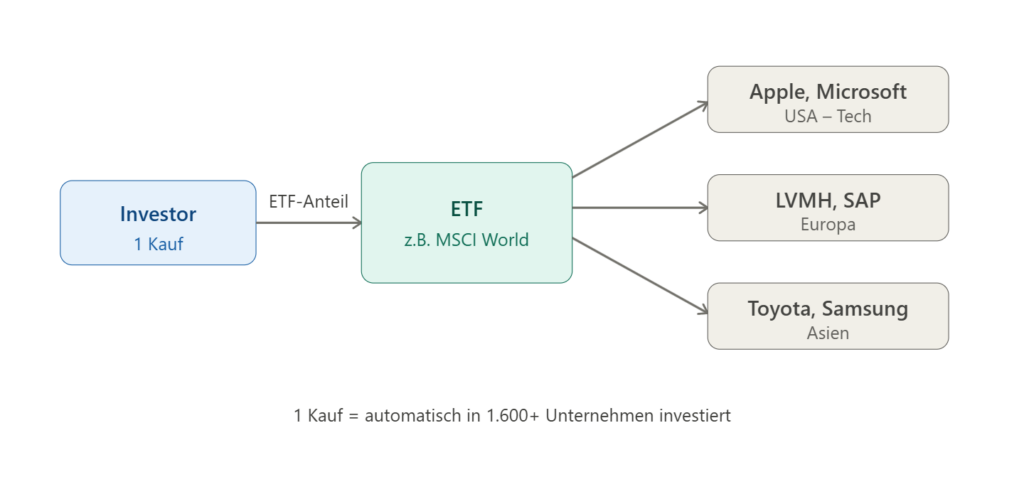 ETF steht für Exchange Traded Fund – auf Deutsch: börsengehandelter Fonds. Das klingt erstmal komplizierter als es ist.